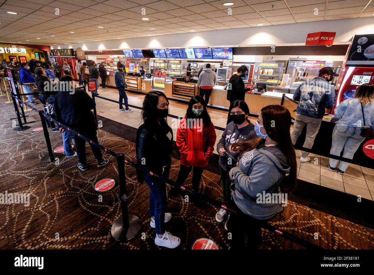 Los Angeles California Usa 15th Mar 2021 Moviegoers Wait In Line To Buy Food And Drinks At The Amc Theater On The First Day Of Reopened Theaters After Being Closed Due To